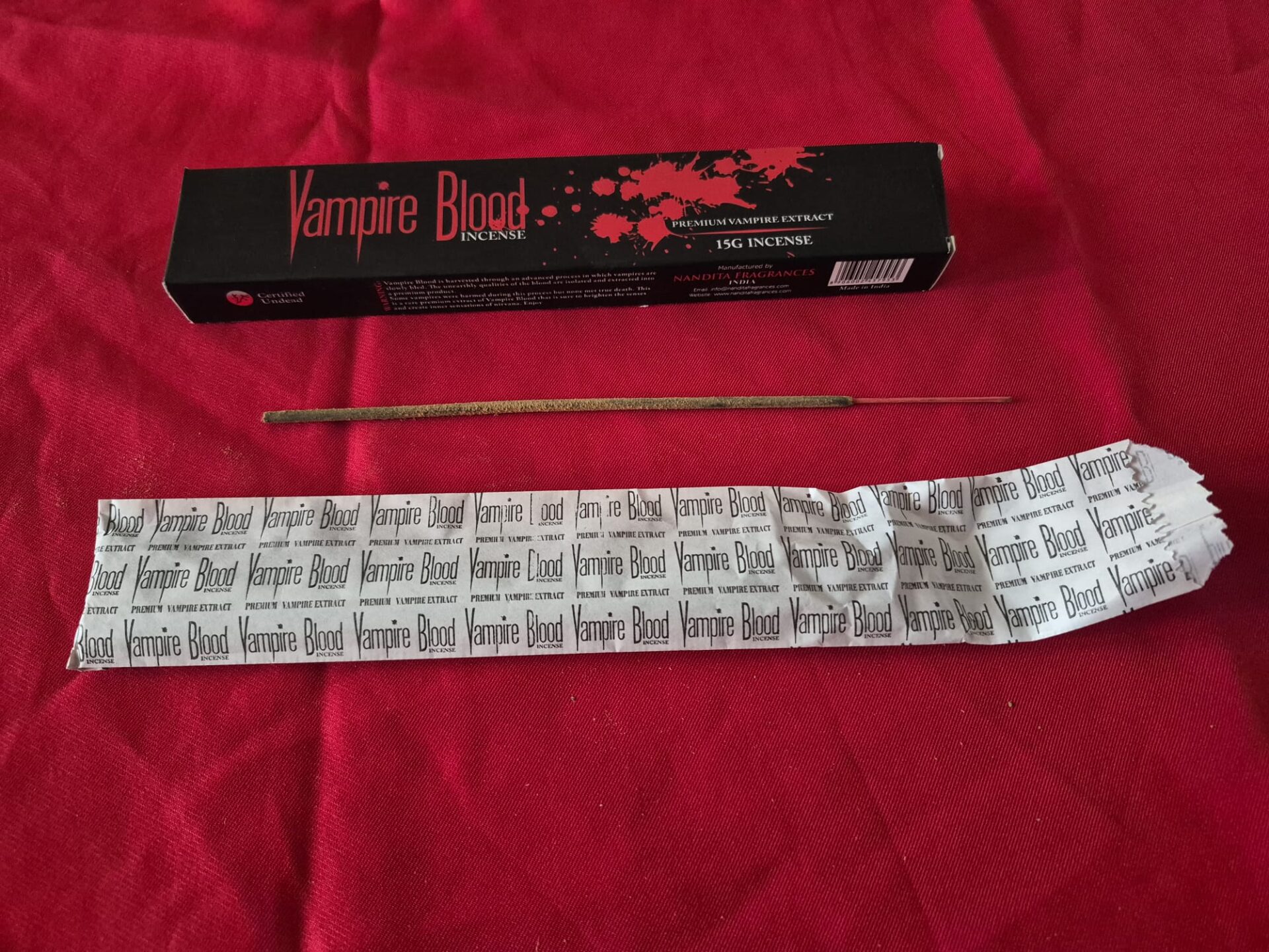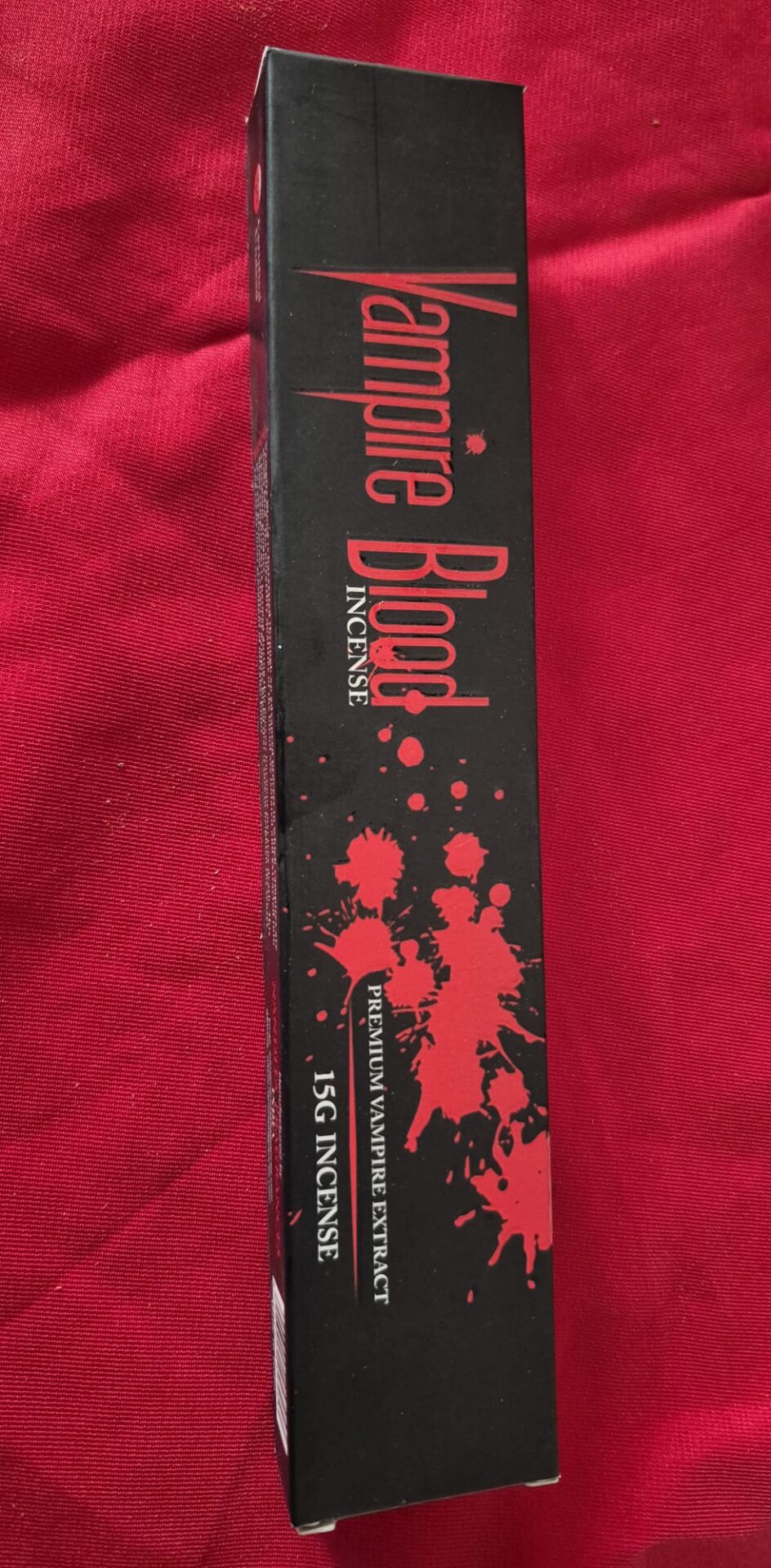 AVERTISSEMENT : Le sang de vampire est récolté selon un procédé sophistiqué qui consiste à saigner lentement les vampires. Les qualités surnaturelles du sang sont isolées et extraites pour créer un encens premium. Certains vampires ont été blessés au cours de ce processus, mais aucun n’a connu la mort. Cet extrait rare et premium de sang de vampire vous procurera des sensations de nirvana et de bien-être. Bon appétit !